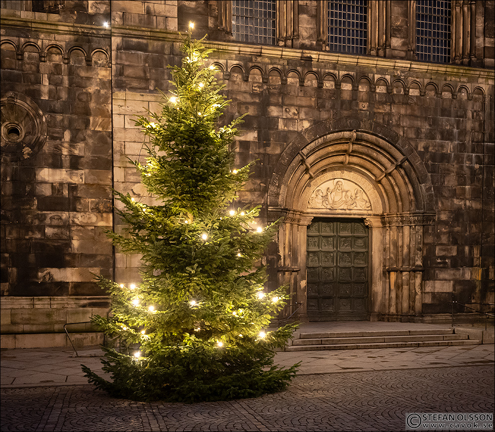 Jag passerade även Domkyrkan där det traditionsenligt står två stora upplysta granar framför ingången. Jag koncentrerade mig på en av dem och fick med den varmt belysta fasaden i bakgrunden.