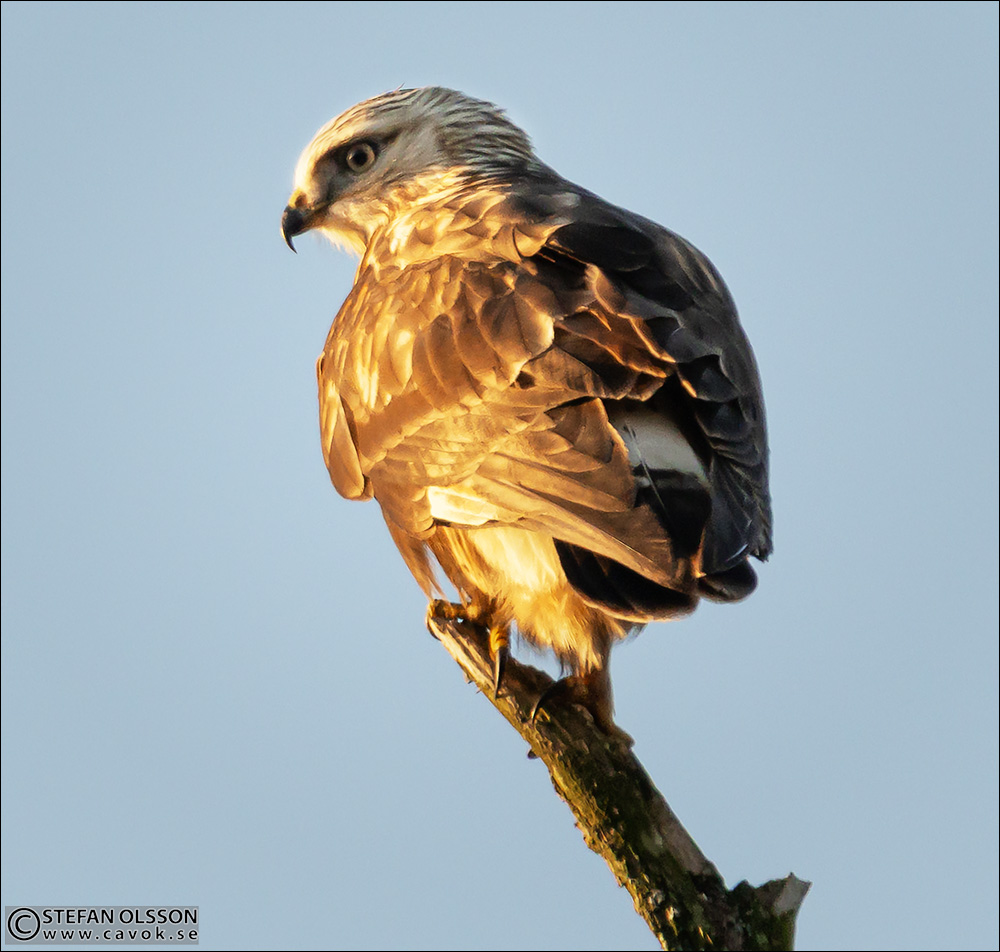 Den här gången kom jag hyggligt nära. Ljusförhållandet var inte helt enkelt. Men det varma infallande kvällsljuset gav ormvråken en närmast gyllene ton. Gul är den ju själva verket inte. Det här ser snarare ut att vara en relativt ljus och sannolikt ganska ung individ. Strax efter jag tagit bilden lyfte fågeln och försvann. Även om resultatet kanske inte blev helt perfekt så blev det trots allt en trevlig bonusbild.