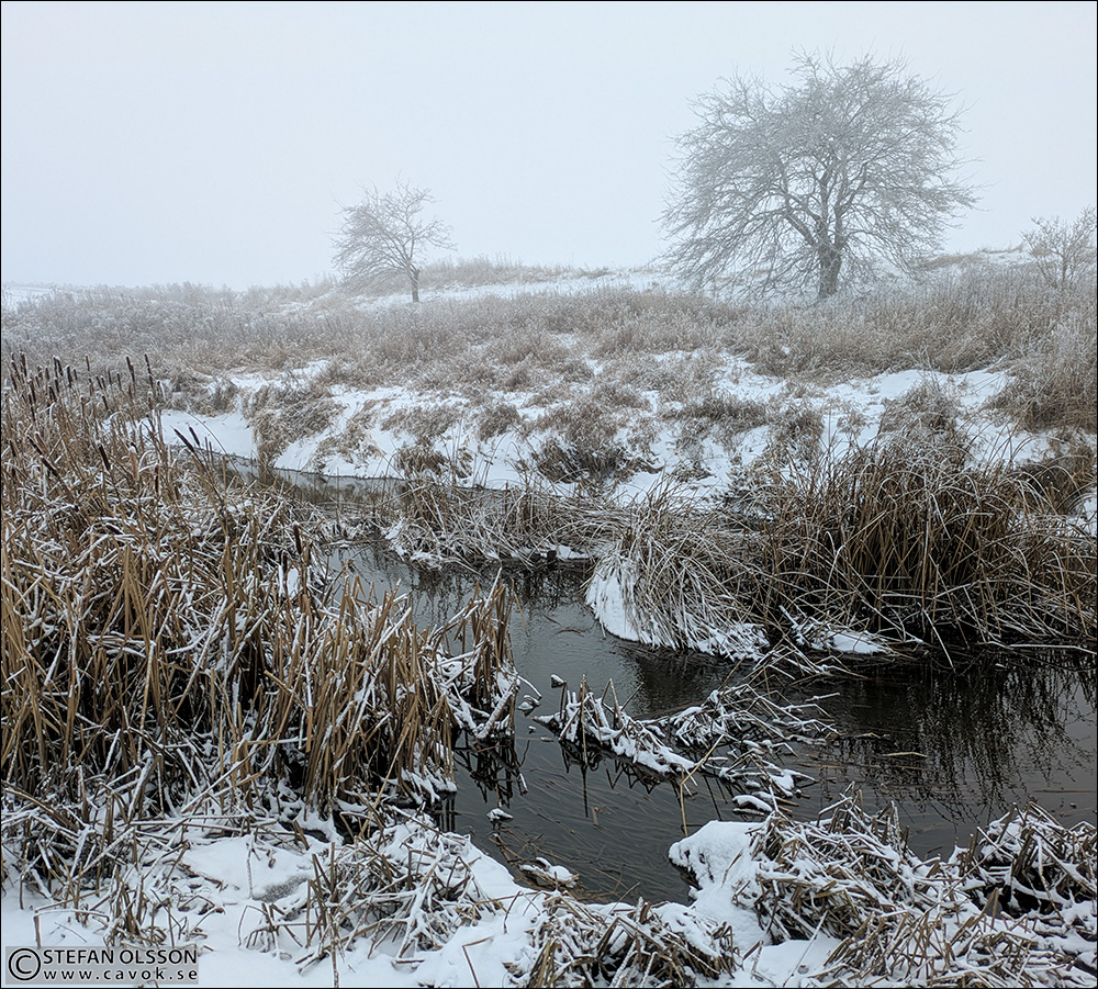 [260106] Först kom det en massa snö – därefter drog dimman in. Och just dimma ger alltid landskapsbilden en helt ny dimension. När jag tidigare idag promenerade längs det än så länge isfria vattnet vid Höje å fångade jag den här bilden.