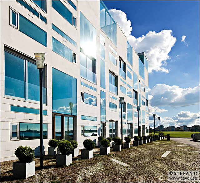 Sundspromenaden Det finns faktiskt vackra oktoberdagar. Som när jag tog den här bilden på Sundspromenaden i Västra Hamnen. Notera hur tydligt himlen och sundet reflekterar sig i fönstren.