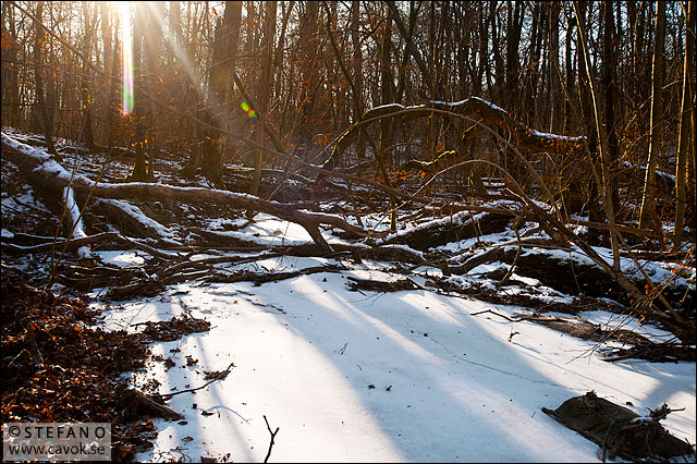 Idag har det varit ett strålande vinterväder i Skåne. Jag tog ledigt och begav mig ut till Dalby Söderskog för att försöka fånga lite nya bilder. Det gick väl sådär, men ett par hyggliga rutor fick jag trots allt med mig hem. Som vanligt blev motljusmotiven bäst. Denna är tagen intill den lilla bäcken som rinner rakt genom skogen. Efter den senaste tidens kyla var bäcken nästan helt bottenfrusen. Jag hörde förresten en del fågelkvitter i skogen idag. Och solen värmde faktiskt mer än den gjort tidigare i år. Kan det vara så att våren är på väg trots allt?