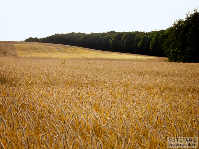 När jag var ute och cyklade igår blev jag överraskad av hur mycket landskapet har förändrats på bara ett par veckor. Den senaste tidens torka och högsommarvärme har gjort att färgtonen alltmer börjar övergå från grönt till gult. Det här gyllene rågfältet mellan Måryd och Södra Sandby är nog snart redo för skördetröskan.