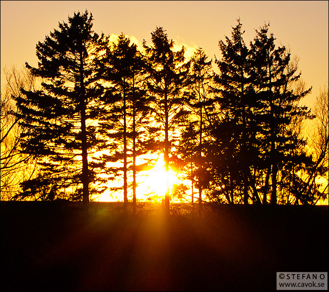 Solnedgång vid Källby Efter en vecka med obefintligt ljus tittade solen plötsligt fram tidigare idag. Jag begav mig raskt ut och fångade den här siluettbilden vid dammarna i Källby.