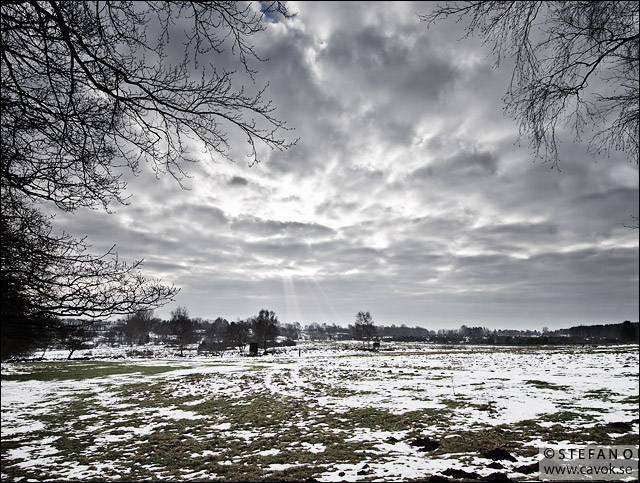 Snösmältning Jag tänkte bjuda på ytterligare en bild från gårdagens lilla utflykt. Ett ganska kargt skånskt landskap där en stor del av förra veckans snö har smält bort. Notera solstrimmorna borta vid horisonten.