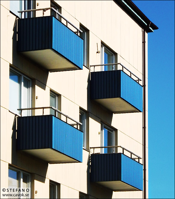 Himmelsblå balkonger Blå balkonger vid Södra Esplanaden i Lund. Huset tillhör BRF Krusbäret och uppfördes av HSB i mitten av 30-talet.