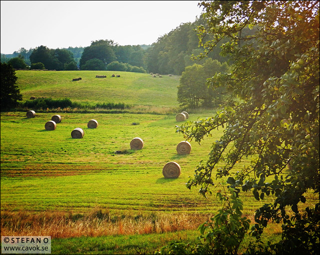 Bilden tog jag längs den slingriga vägen som går mellan Häckeberga och Stenberget. Det torra vädret har gett bönderna ett perfekt tillfälle att slå höet och samla ihop det i stora rundbalar. Nu har ängarna blivit gröna igen.