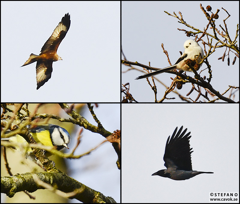 Några mindre lyckade bilder fick jag dock. Och för att jag ska få upp något nytt bildmaterial på bloggen har jag klippt ihop dem till ett litet kollage. På översta raden en glada och en stjärtmes. Därefter en blåmes och en flygande kråka.