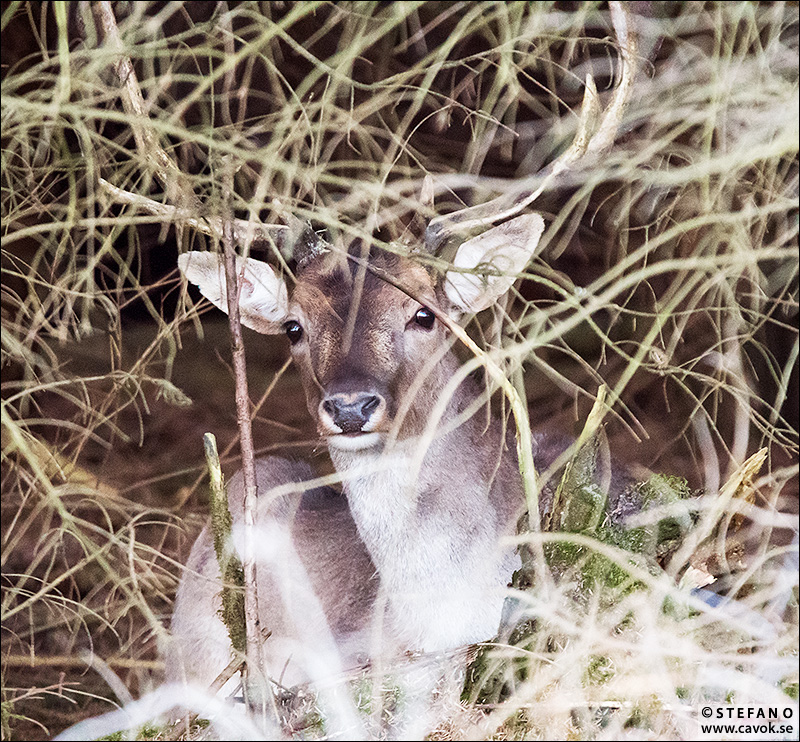 Efter att saktat ner farten för att kolla lite mer noga såg jag plötsligt två mörka ögon där inne i dunklet. Sedan kunde jag ana de stora hornen. Visst var det en dovhjortstjur som låg därinne bakom grenarna. Det enda märkliga var att han låg kvar. Avståndet var trots allt bara ca 25 meter mellan mig och hjorten. Min egen teori är att han låg i en halvdvala och därmed inte upptäckte mig omedelbart. Vad jag vet sover inte hjortar med stängda ögon.