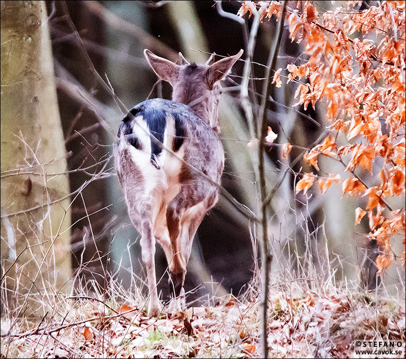 Igår lyckades jag springa på en grupp dovhjortar. Att jag över huvud taget upptäckte dem var inte något annat än ren slump. För när jag gick längs en liten skogsväg, primärt i jakt på fågelbilder, noterade jag något som vid första ögonkastet såg ut som en sten i den täta granskogen. Samtidigt reflekterade jag över att, om det nu var en sten, så påminde färgtonen väldigt mycket om dovhjortens vinterpäls.