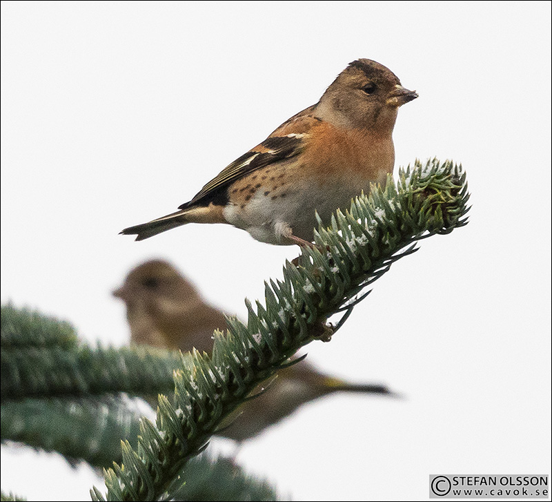 När jag var ute i skogen för ett par dagar sedan hittade jag en liten granplantering där olika finkarter höll till. Bland annat den här bergfinken, som satt och spanade på en gren uppe i en hög gran.