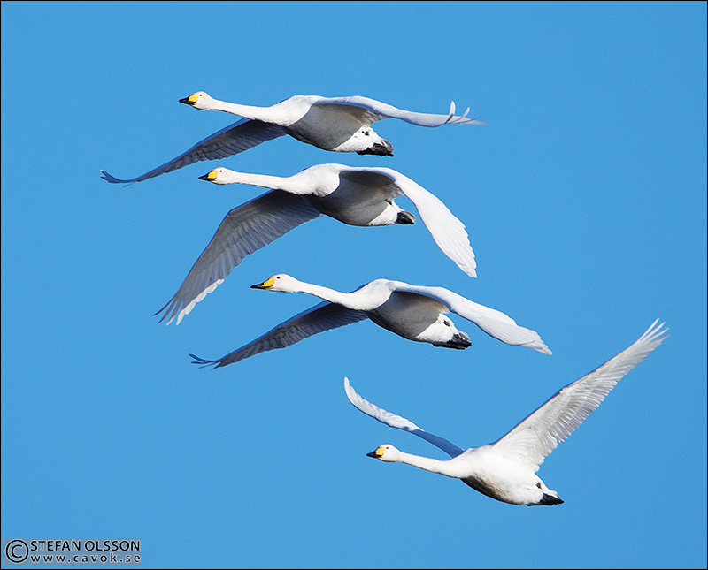 I Skåne är sångsvanar inte alls lika vanliga som knölsvanar. Därför blev jag extra glad när jag såg denna kvartett komma flygande längs Krankesjöns strand för några dagar sedan.