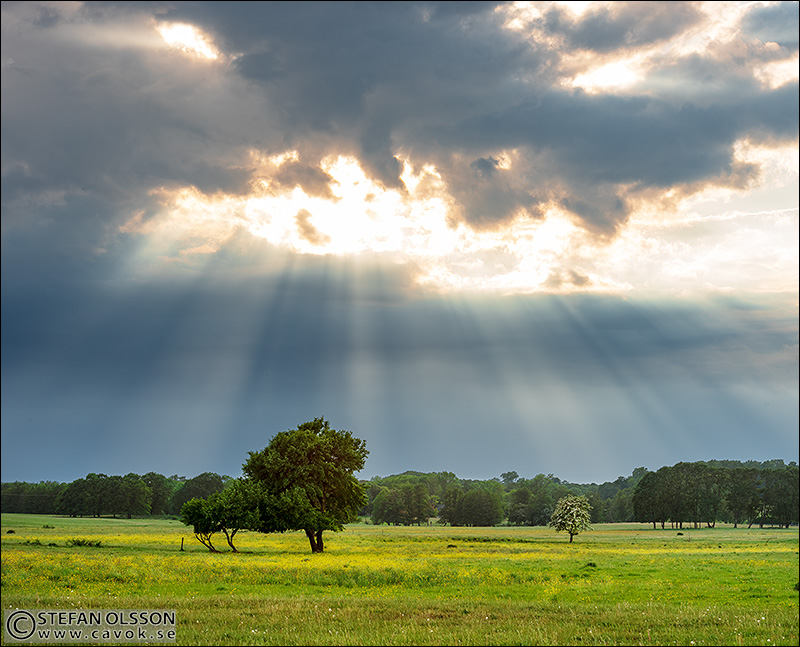 Nu är ju solsken långt i från ett måste om man vill ha trevliga landskapsbilder. På det ena eller andra sättet gör ljuset ändå ett avtryck i motiven. I just den här bilden försökte solen tränga igenom en liten lucka mellan molnen. Den lyckades så pass att det bildades härliga solstrimmor över fältet.