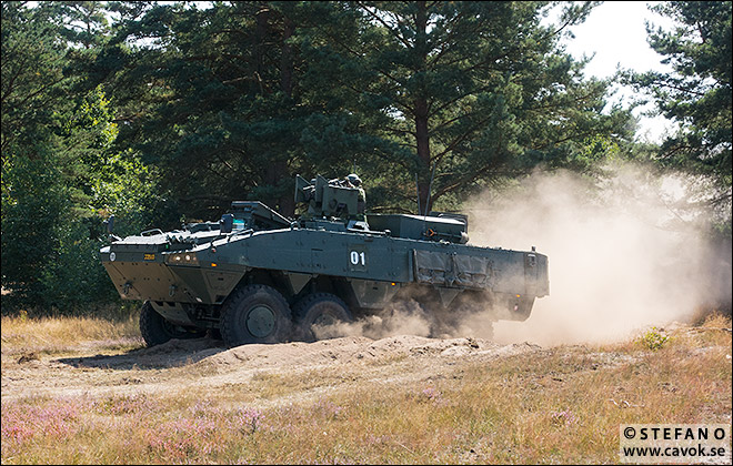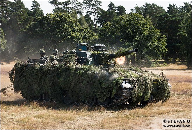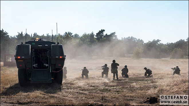 Framryckning med Stridsfordon 90. Notera mynningsflamman från kulsprutan i tornet. Det är naturligtvis lösa skott som används.