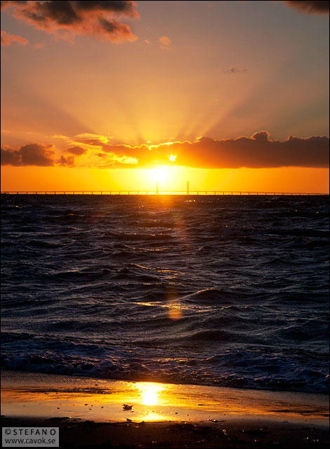 Det har ju blivit ett antal solnedgångsbilder från Lomma genom åren. Med vad gör det så länge de är trevliga att titta på. Denna tog jag en blåsig novemberkväll för fem år sedan. Öresundsbron syns tydligt borta vid horisonten.