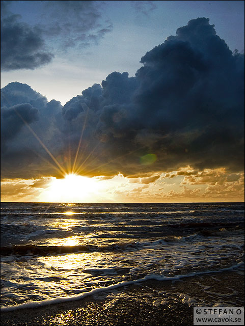 Denna aftonbilden fångade jag på Mellbystrand sommaren 2007. De kalla och mörka regnmolnen kontrasterar sig perfekt mot det gyllene kvällsljuset.