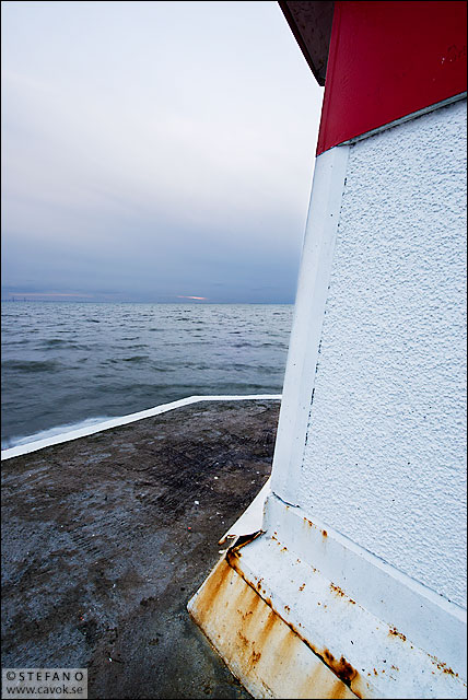Hamnpiren i Lomma fotograferad en småkylig februarikväll för exakt fyra år sedan. Jag tycker det är ganska läckert hur de fasta linjerna och distinkta röd-vita färgtonerna på pirmärket möter det diffusa och oroliga havet. Längst borta i horisonten går det att ana en tunn strimma kvällssol.
